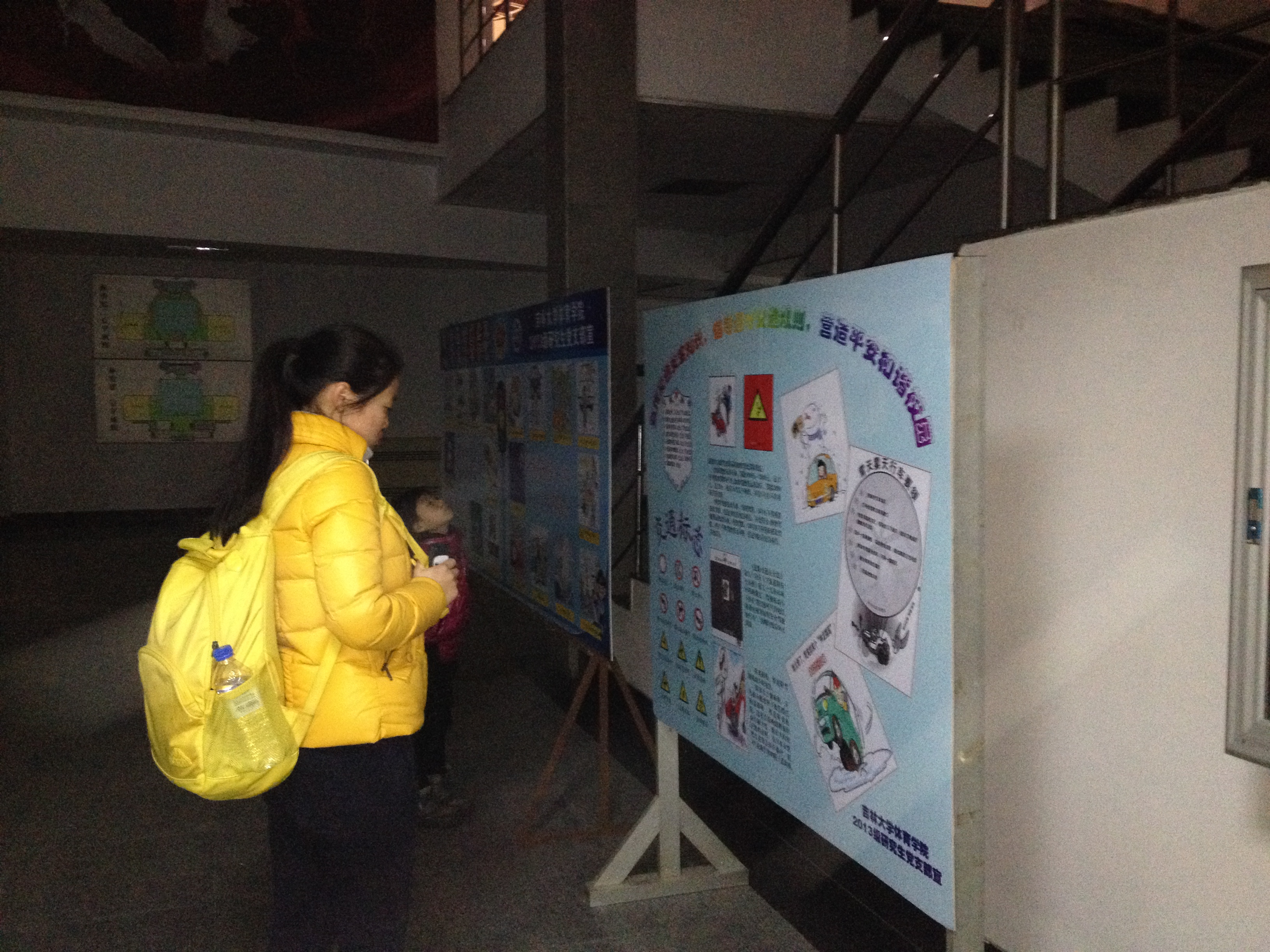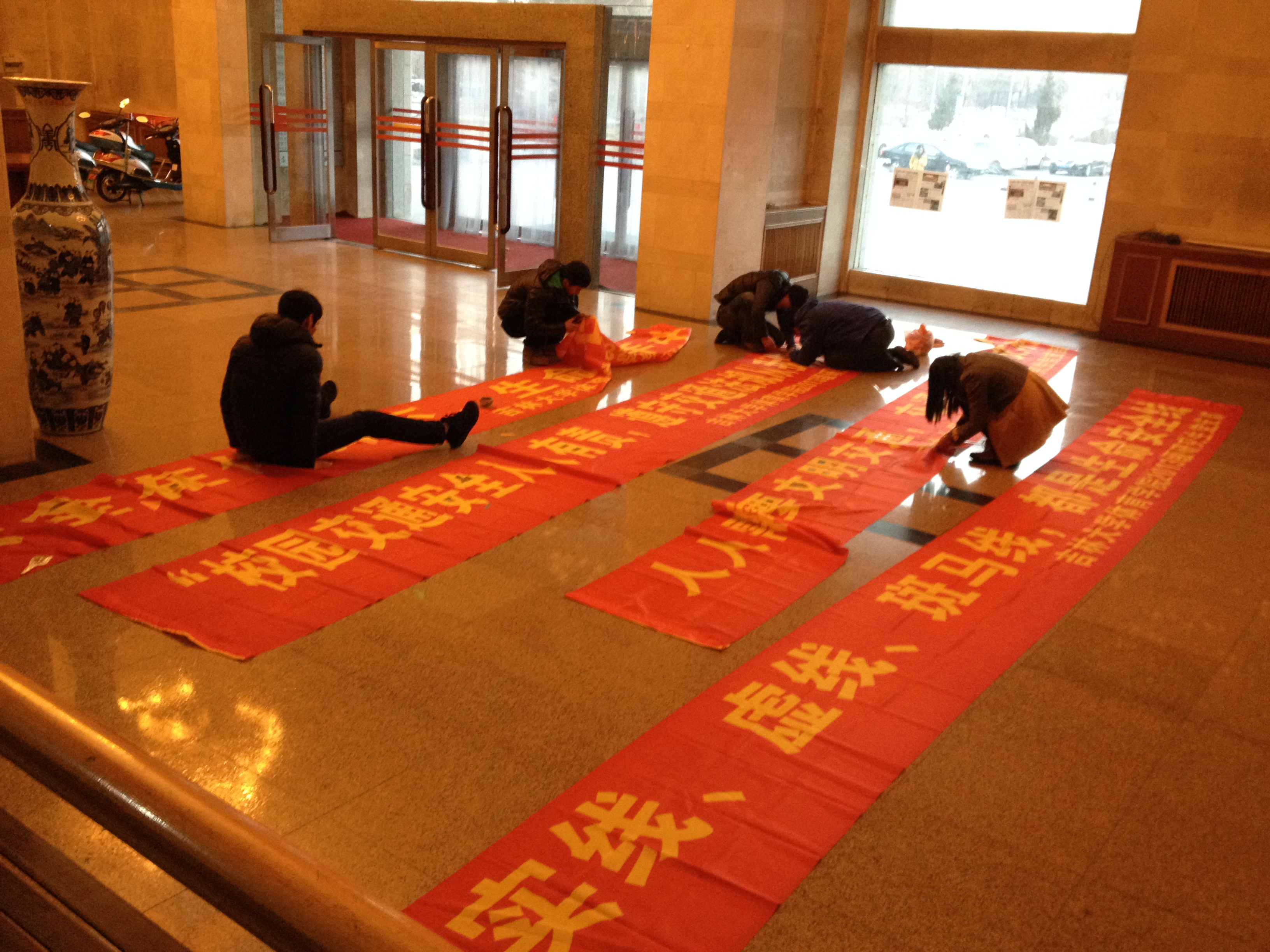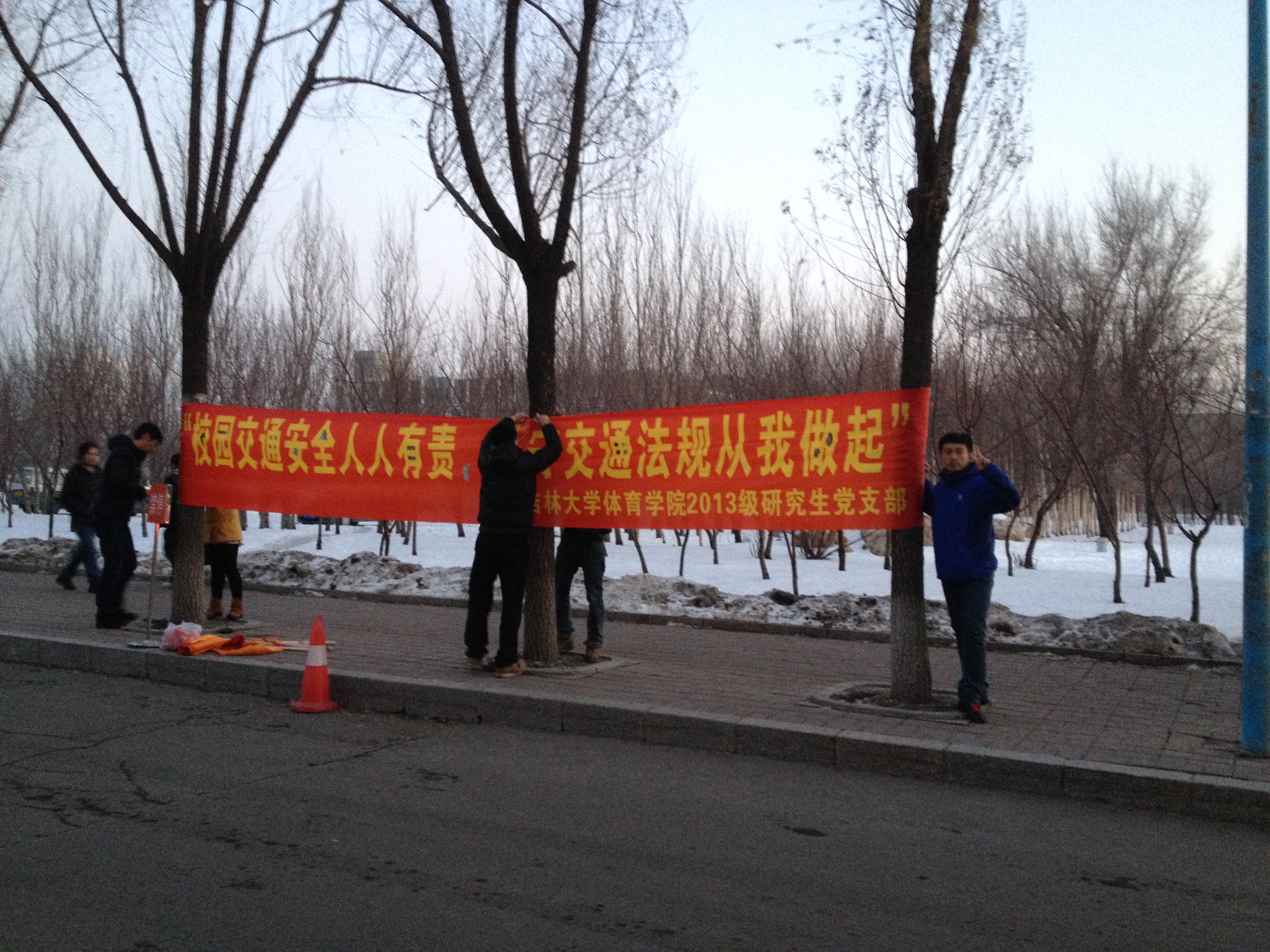 党员和积极分子分工合作,首先将条幅、展板、宣传单页等活动准备材料取回。由于冬季天气寒冷风大,为了保证条幅在外悬挂时的稳定性,首先对条幅进行了防风处理,后对展板精心布置,增加了展板的可观赏性和稳定性,准备工作完成后,党员和积极分子分组将条幅的悬挂在行政楼南侧、体育馆北侧、中国银行自助银行北侧沿线等主干路两侧,这里也是人流、车流汇集、叠加的路段,更是确保校园交通安全的重点路段,最后,党员和积极分子同学们又将展板摆放到行政楼南侧,展板由“交通法规”、“交通标志”、“安全出行要点”、“校园交通注意事项”、“机动车和非机动车、行人十大交通陋习的危害”等交通安全知识,交通法规组成的,条幅和展板刚刚布置好,就吸引了许多同学驻足观看,同学们在图文并茂的宣传中了解了交通安全知识和法规,也理解了交通陋习的危害,增强了同学们交通安全意识。在布置条幅和展板的过程中多次遇到校警同志,他们认为本次宣传活动主题和内容都非常实用并有着积极的意义。