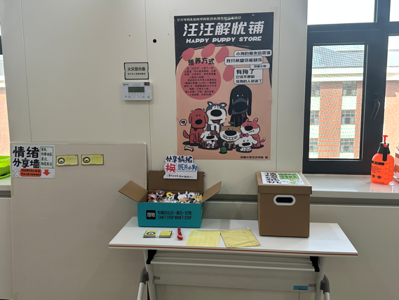 活动准备前期,tyc122cc太阳成集团与艺术公司研究生合作,共同绘制、裁剪制作了许多可爱的纸片小狗,并精心设计了活动海报及宣传标语。5月6日上午7点30分:“汪汪解忧铺”正式开业!许多同学闻声前来,将自己亲手书写的情绪“汪汪币”张贴在情绪分享墙上或是将其投入在“情绪碎纸机”中,以换取领养专属可爱小狗的资格。在48小时的活动时间内,所有的小狗都有了自己的“新主人”!