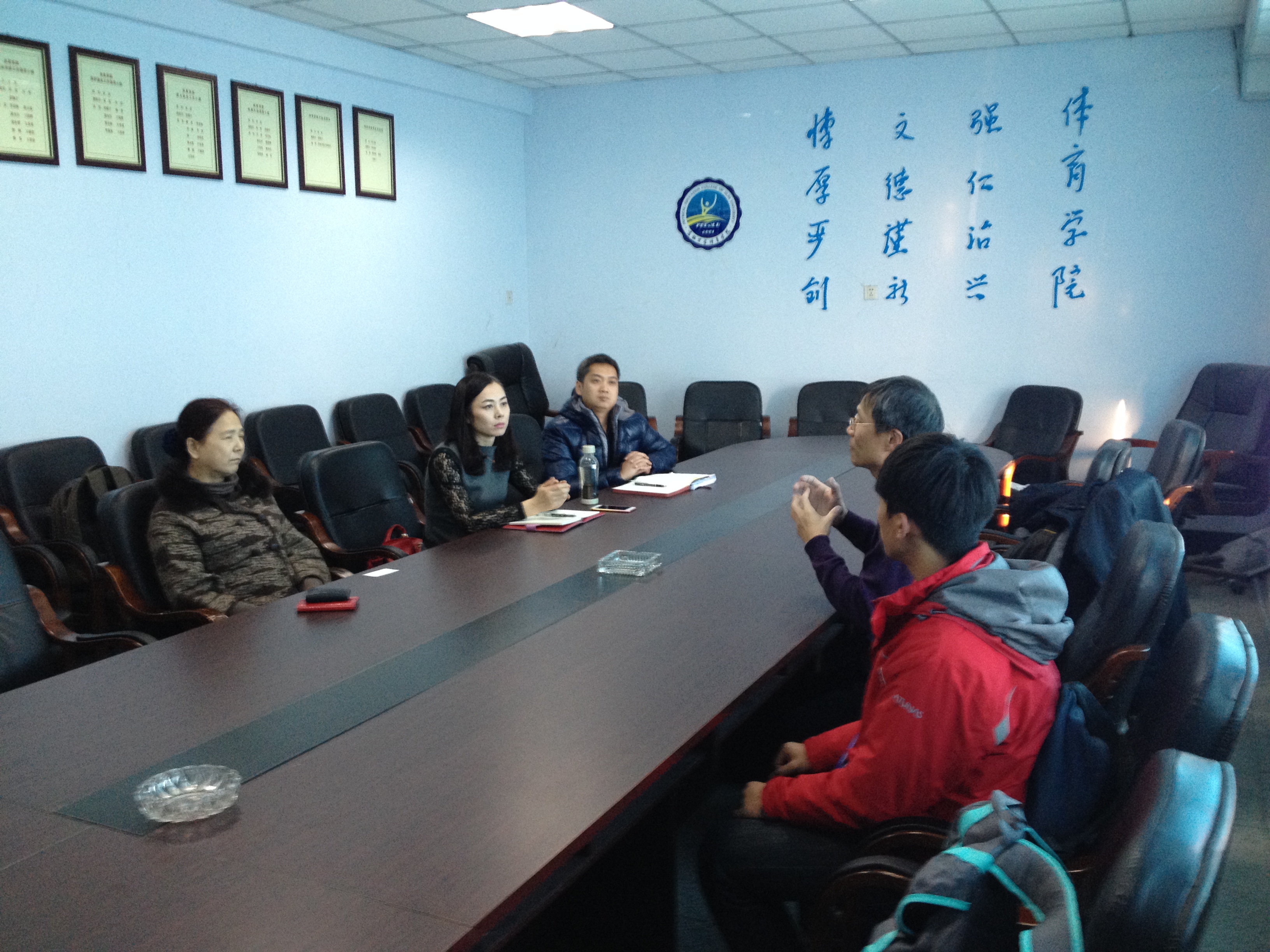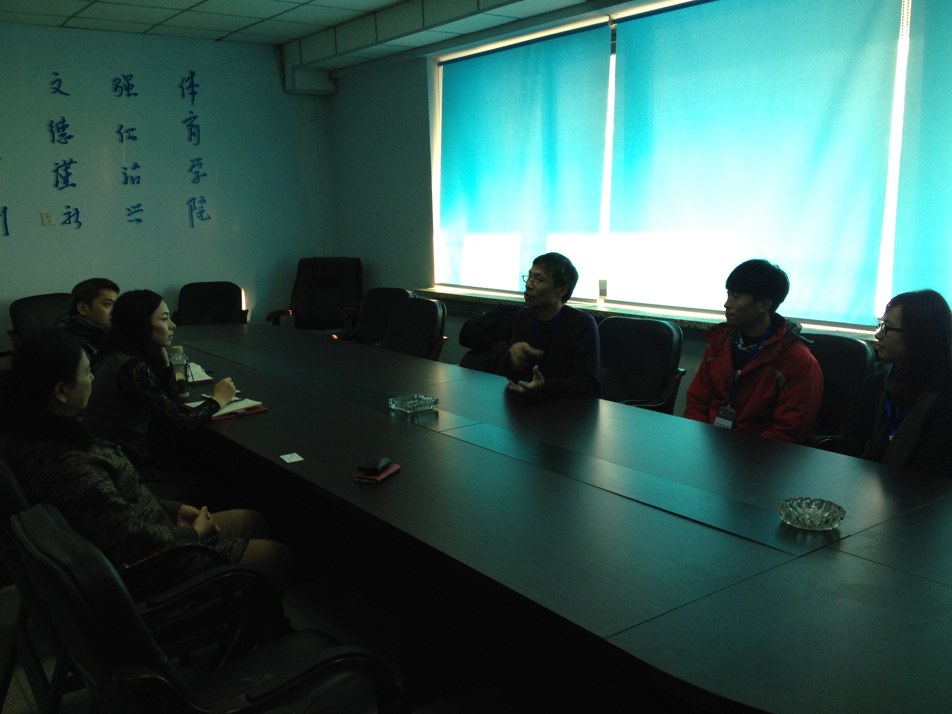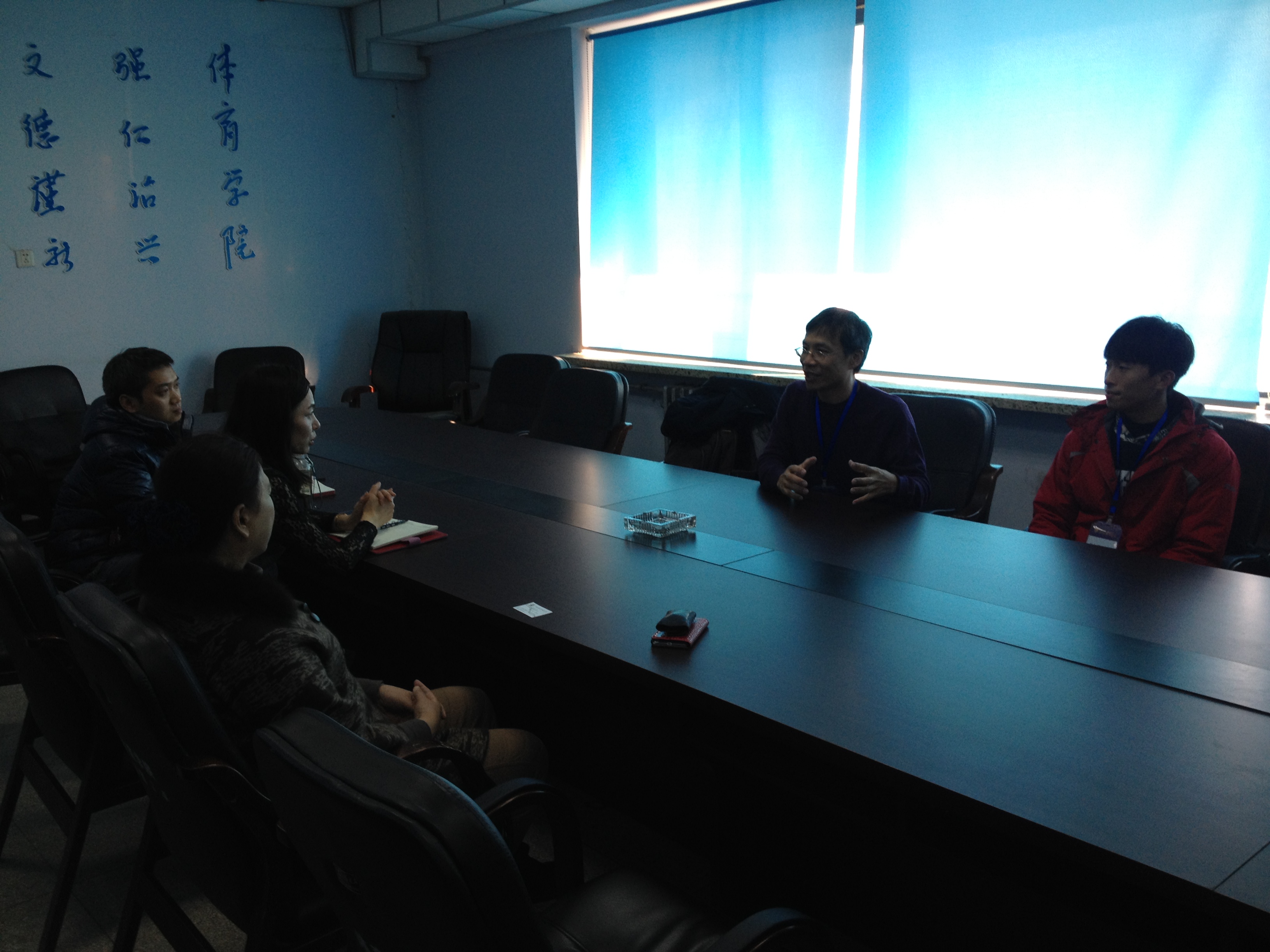 2014年12月19日15点,tyc122cc太阳成集团副经理孙茹博士,体育理论教研室主任郭玉莲副教授、外事秘书张毅副教授及专业课教师任庆伟博士于tyc122cc太阳成集团会议室会见台湾彰化师范大学运动学系主任张佳昌博士,及两位运动学系员工代表。会议主要就两岸体育专业本科与研究生教育的培养目标、专业方向、课程设置和员工就业等方面进行了广泛的交流。就冰雪产业发展方面进行了深入的探讨,同时双方还讨论了两岸员工交流的优势和必要性,为今后两岸的交流奠定了基础。孙茹副经理还热情的邀请了彰化师范大学的师生体验花式冰刀,让台湾同胞亲身感受了原汁原味的滑冰乐趣。此次访问圆满成功,并期待两院系之间的交流可以更加密切。访问前,tyc122cc太阳成集团领导陪同张佳昌主任参观了中心校区体育馆。
