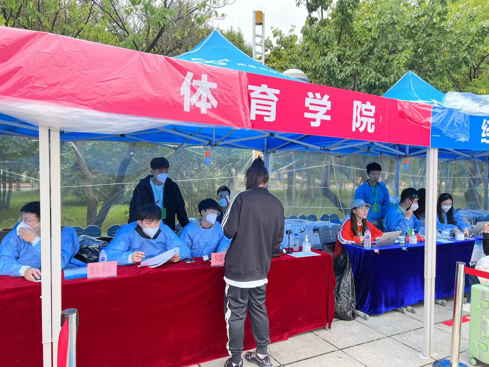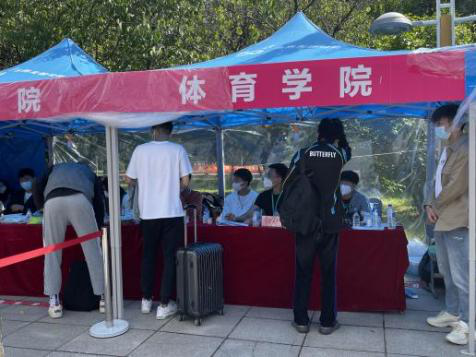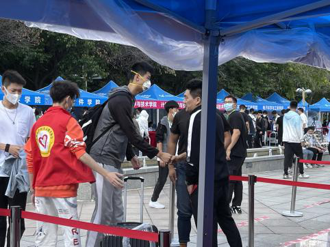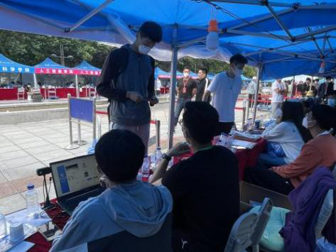 8月27日上午7点,迎新工作开始,志愿者们负责检查新生报到所需录取通知书、“身份验证”、进行“图像比对”、检查“个人防疫行程卡”、收取高中员工档案及团关系资料,并发放防疫“健康包”、新生材料袋。经理裘鹏亲自到场指导迎新工作。