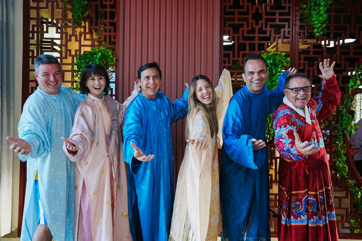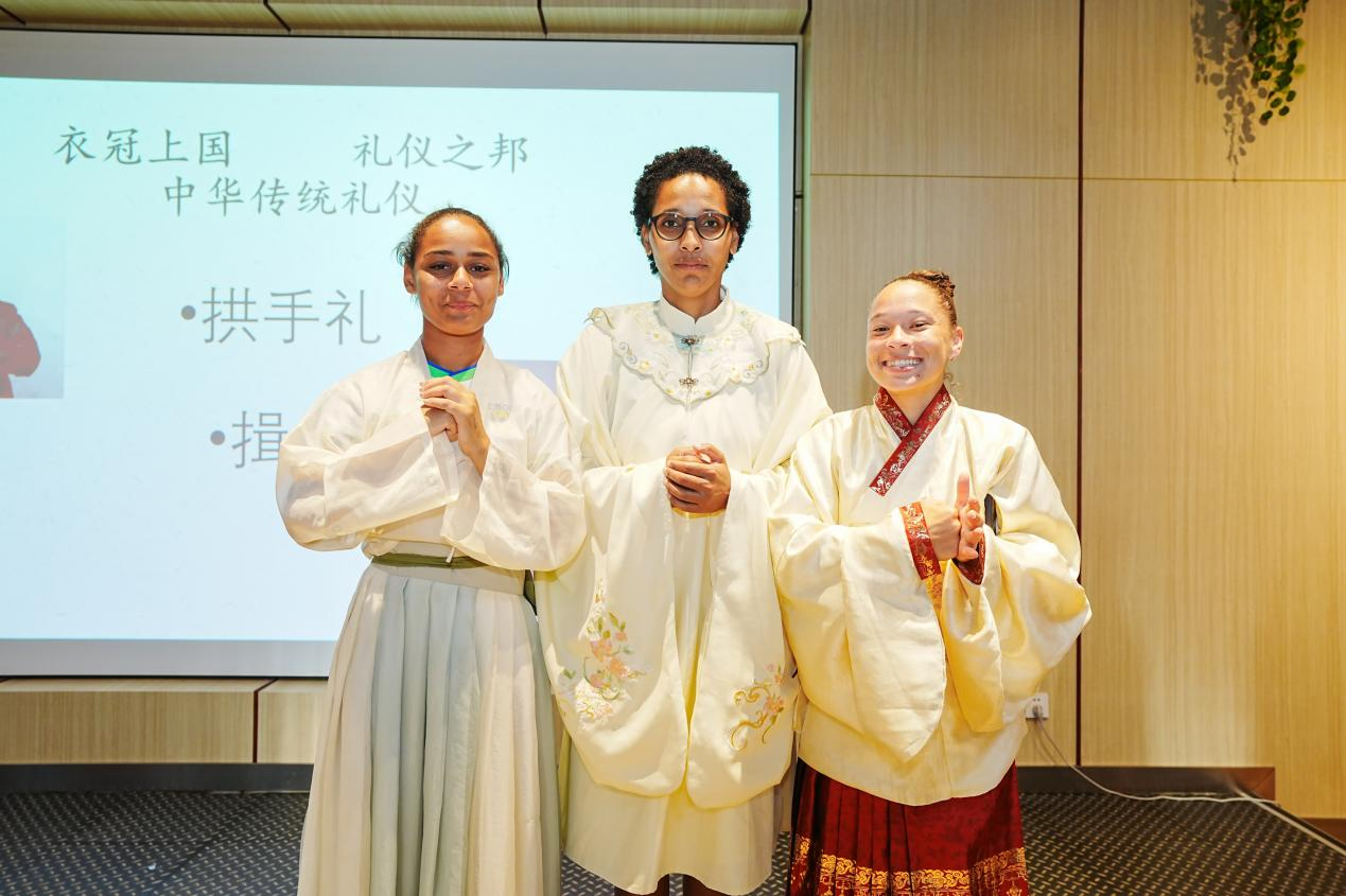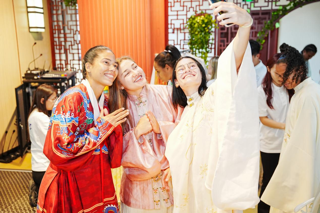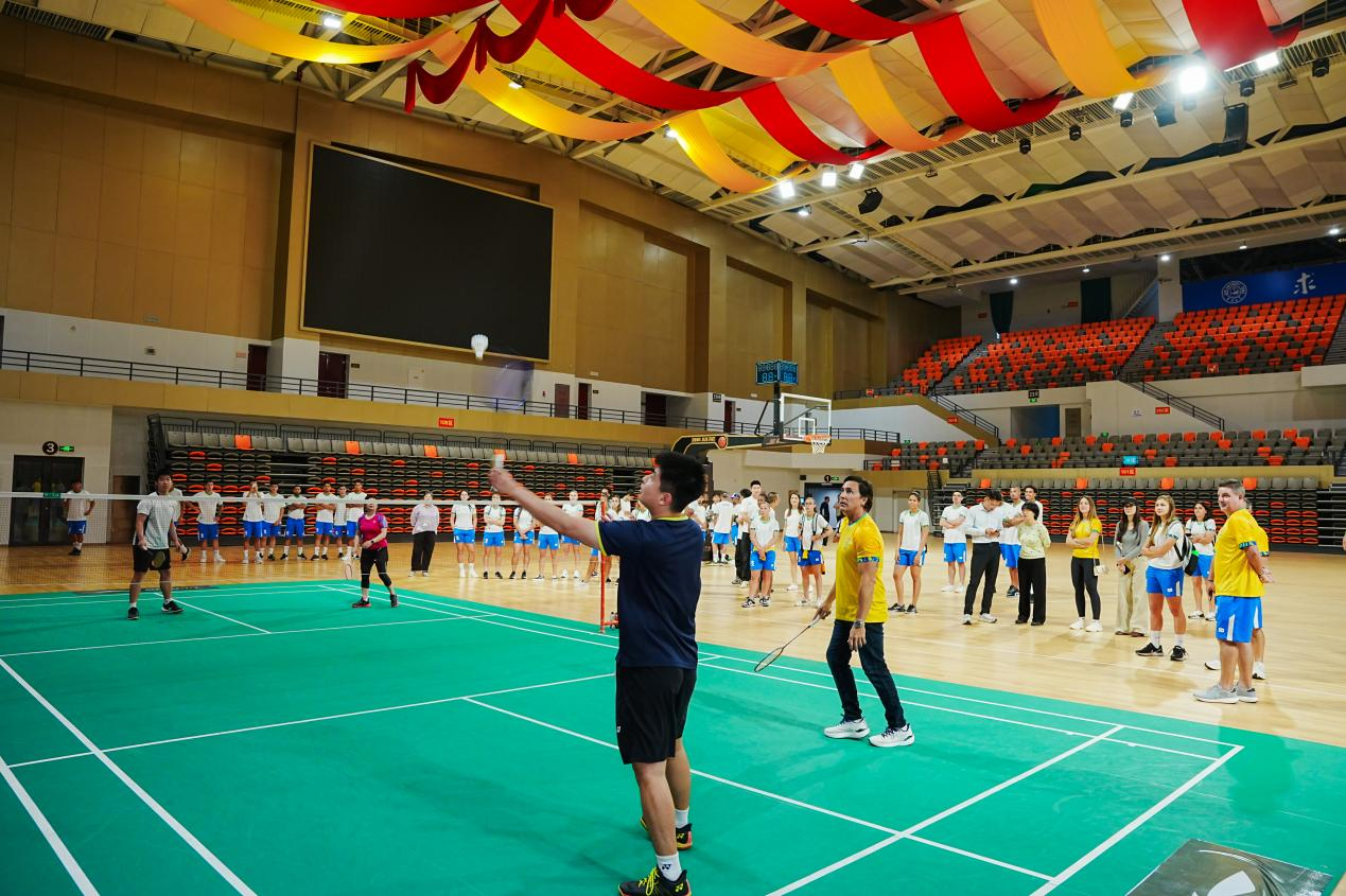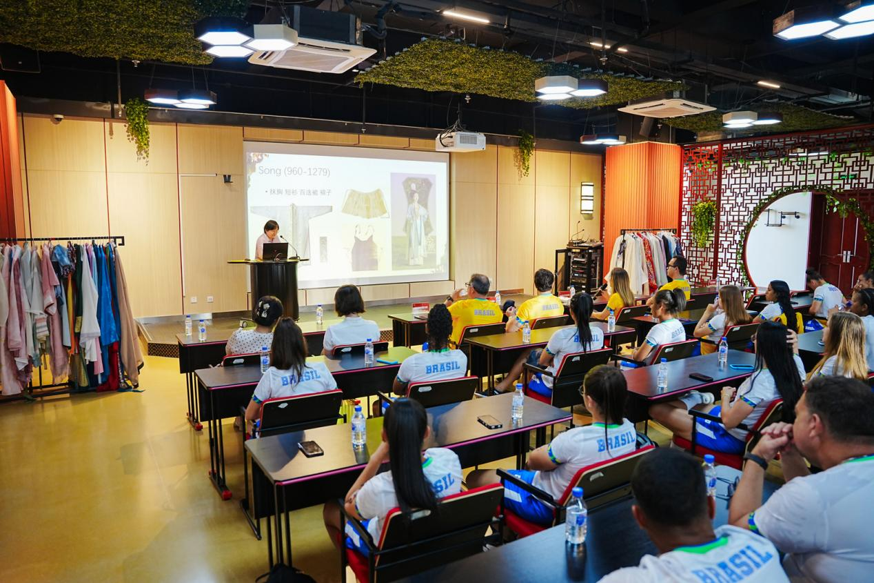 下午,巴西代表团体验了丰富多彩的中国传统文化活动。成员们身着传统汉服,在外国语言文化公司徐倩秋教师的细致讲解中,探寻汉服的形制美学、纹样寓意,亲身触摸中华服饰文化的深厚底蕴;随后,代表团参观校园体育设施,重点探访宋治平体育馆,深入了解公司体育场馆建设、运动员训练保障体系及校园体育活动开展情况,对公司“体教融合”的育人模式给予高度认可。