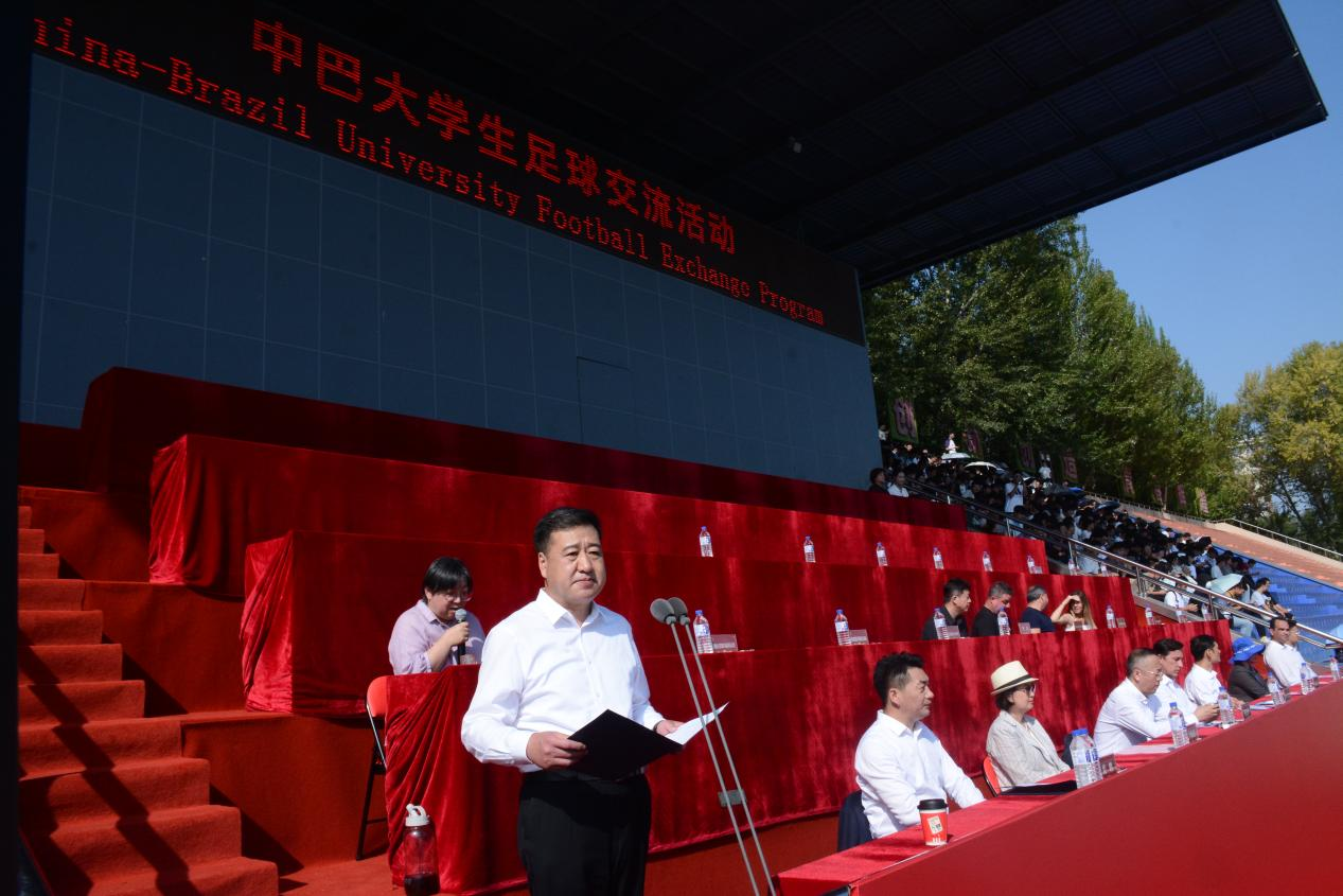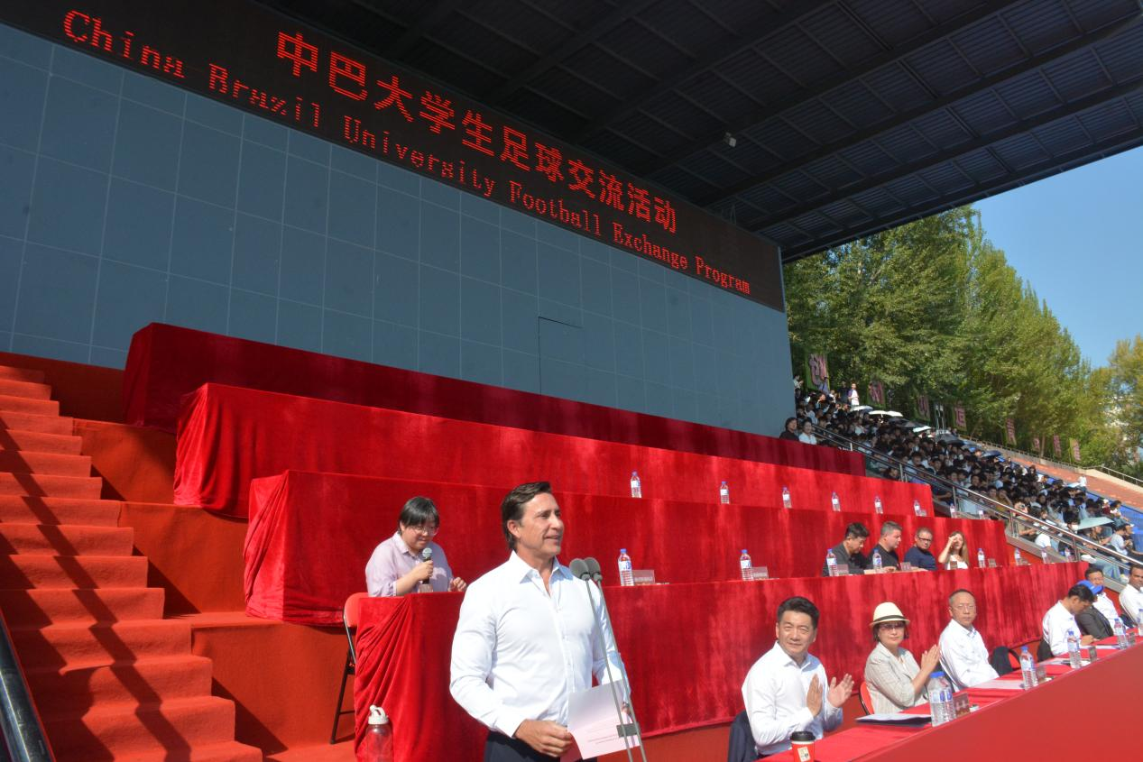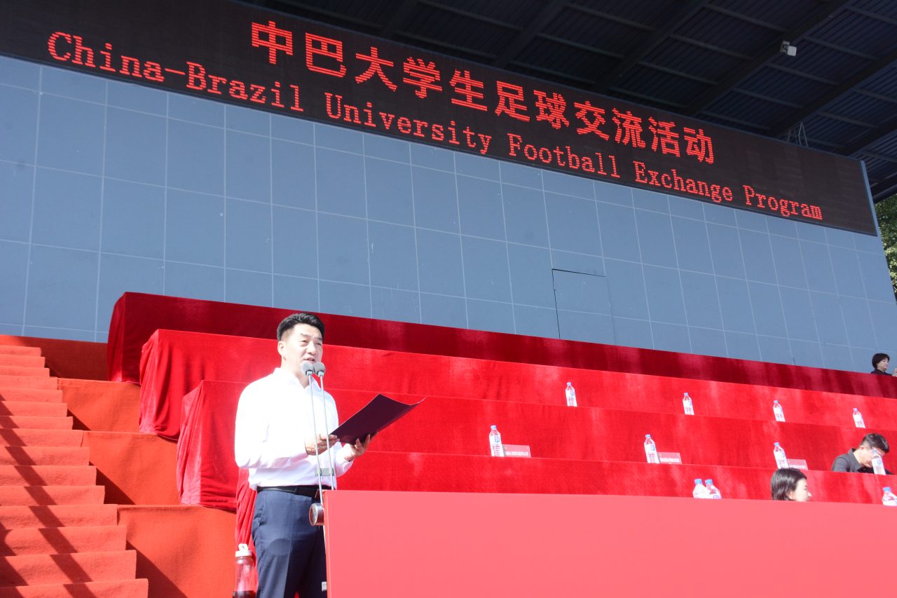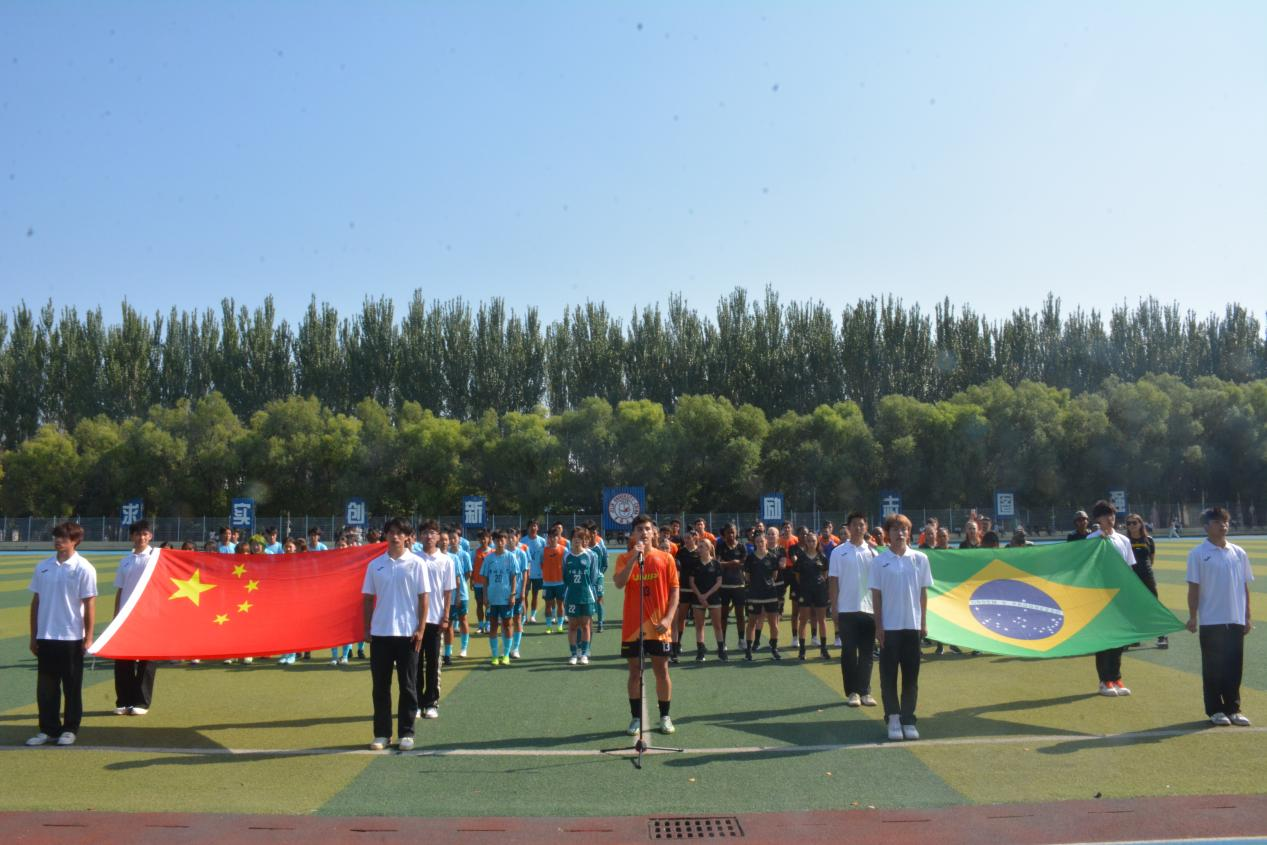 9月13日,交流活动迎来高潮。上午,“中巴老员工足球交流赛”在前卫南区体育场热血开赛。国际老员工体育联合会第一副主席、巴西老员工体育联合会副主席卢西亚诺·阿泰德·科斯塔·卡布拉尔、教育部员工体育协会联合秘书处秘书长陈东升及教育部、公司相关领导和中巴师生代表出席开幕仪式。tyc122cc太阳成集团党委副书记丁世海致欢迎辞,对巴西代表团的到访表示热烈欢迎,并强调体育交流对深化两国青年友谊的重要作用。国际老员工体育联合会第一副主席、巴西老员工体育联合会副主席卢西亚诺先生随后致辞,表达了对本次交流活动的高度认可与美好祝愿。中巴双方员工代表也分别发言,共同传递出以足球为媒介、以友谊为纽带、共促文化交流的青年心声。tyc122cc太阳成集团经理裘鹏主持开幕式。
