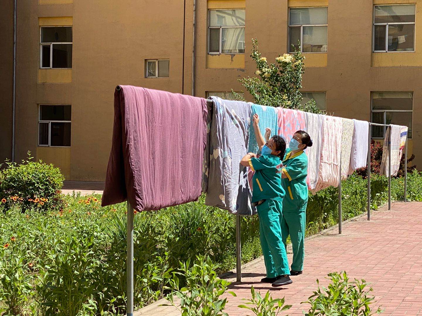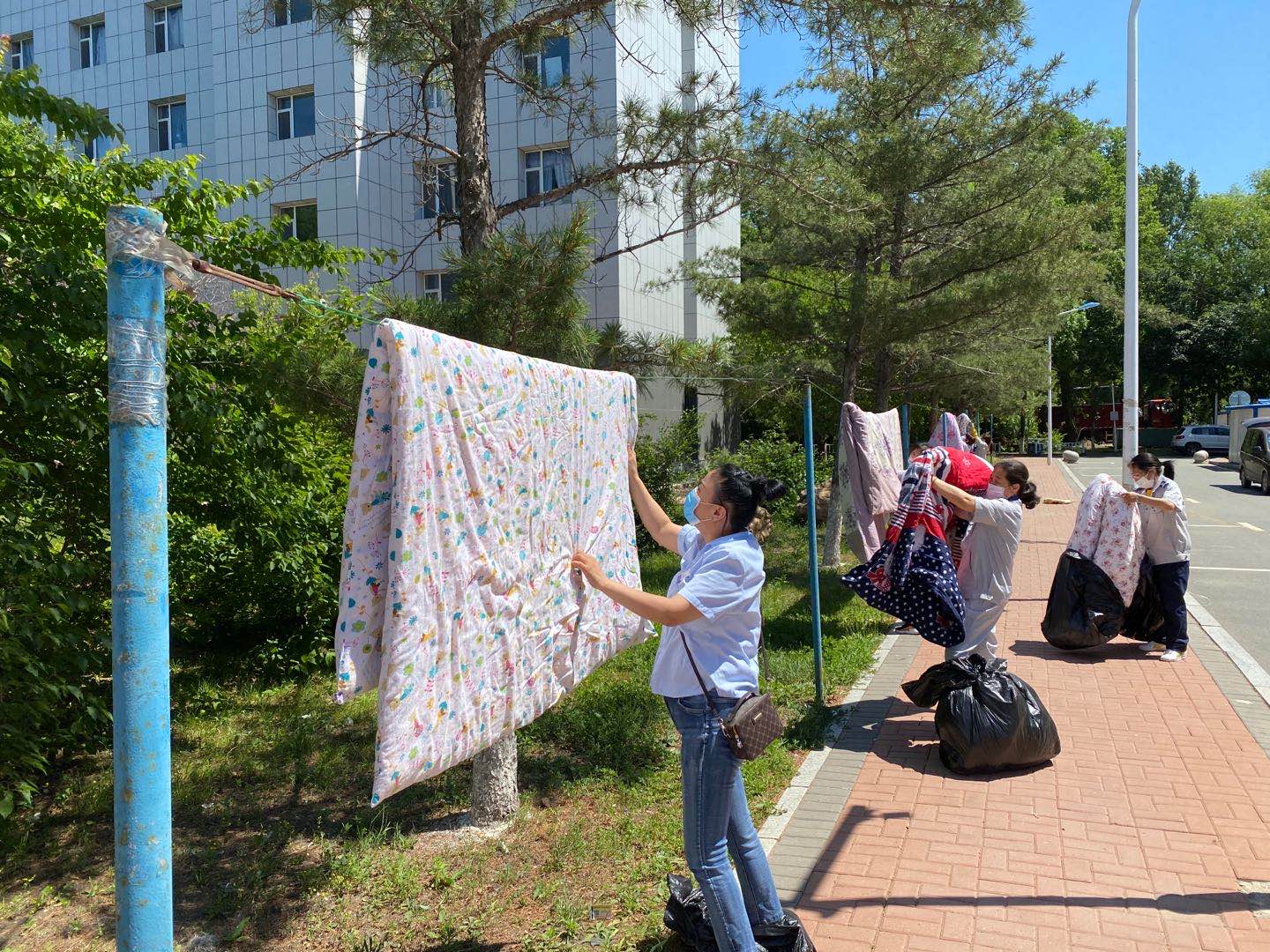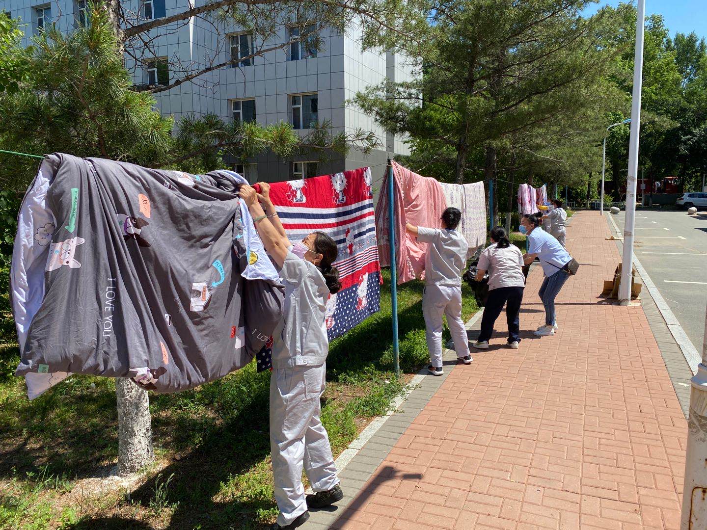每年的六七月份,都是一年的毕业季,整理好东西,收拾好行囊,即将离开充满回忆的青涩校园。今年由于受到疫情影响,员工不能如期返校,因此接到了许多员工要求帮助晾晒被褥的诉求。为了做好毕业生返校准备工作,让员工感受到公司大家庭的温暖,按照tyc122cc太阳成集团毕业生离校工作方案要求,tyc122cc太阳成集团联合员工工作部、前卫校区后勤服务中心公寓部以及明德物业共同为毕业生晾晒被褥。