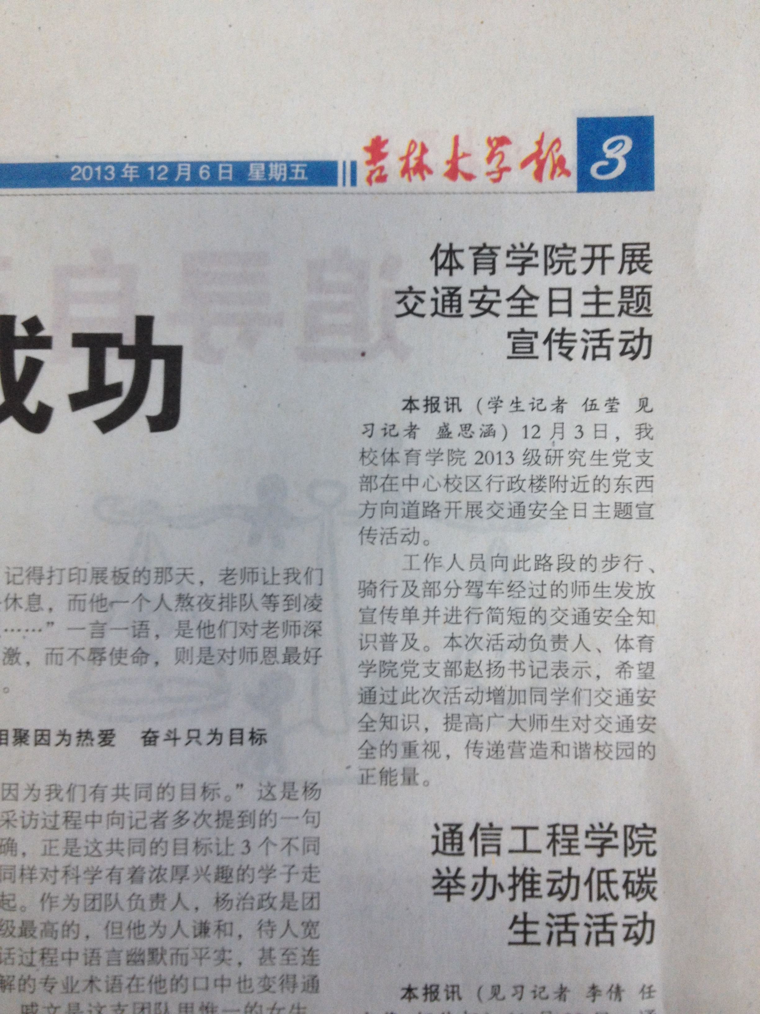 tyc122cc太阳成集团报在2013年12月6日星期五第506期(复第1064期)第三版多彩校园显著位置报道了tyc122cc太阳成集团研究生党支部开展的“宣传交通安全知识•倡导遵守交通法规•营造平安和谐校园”党的群众路线教育实践活动。
